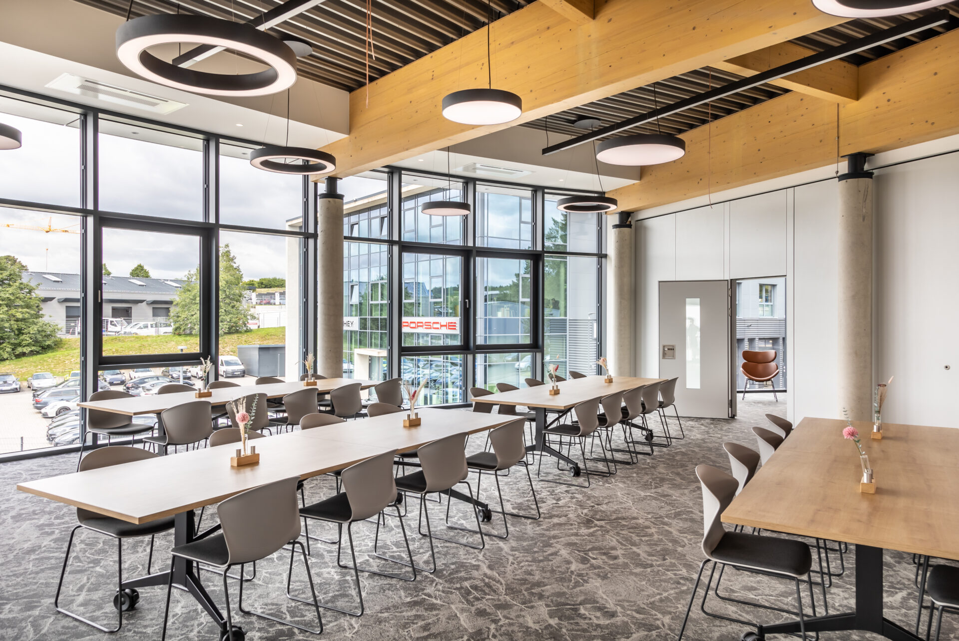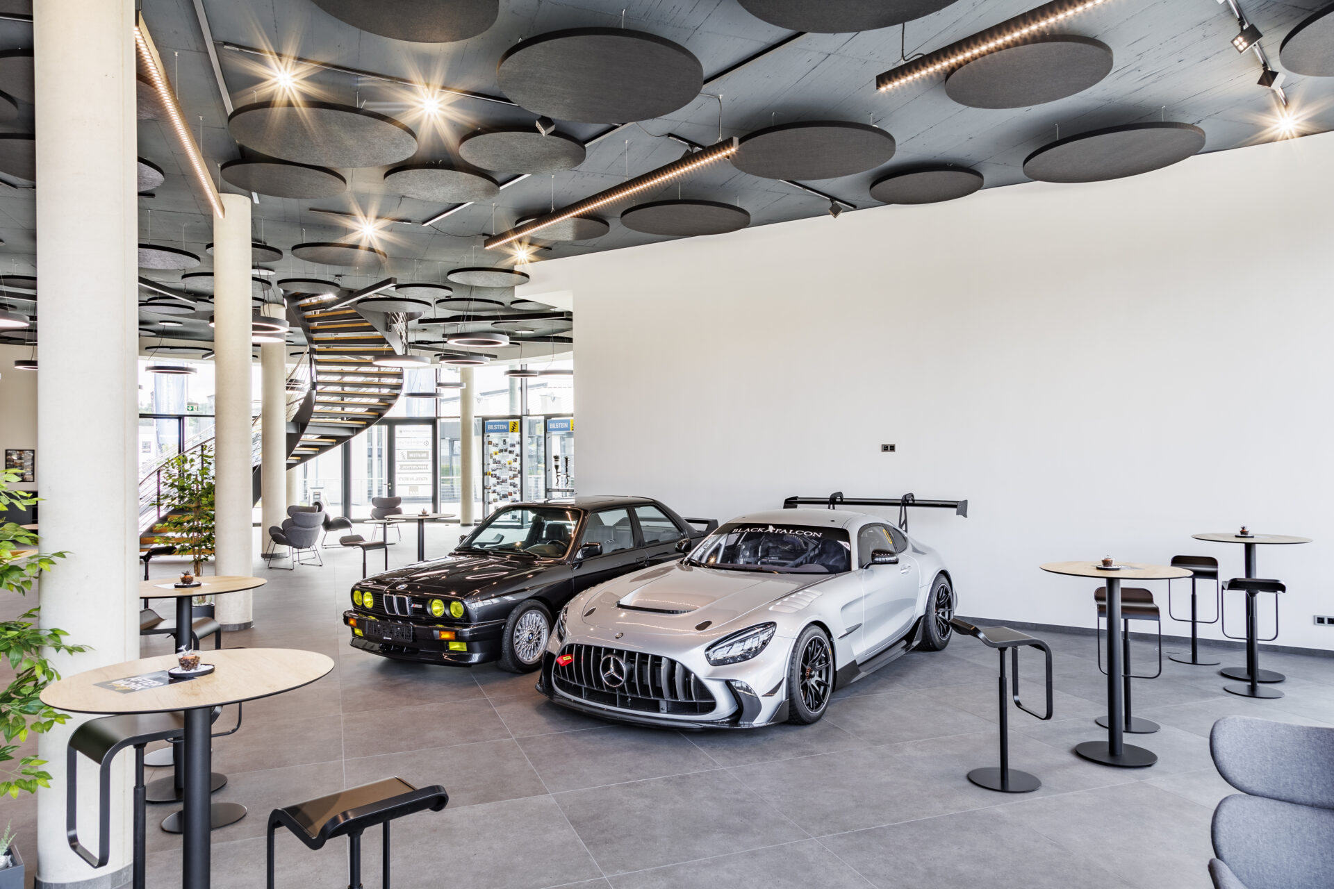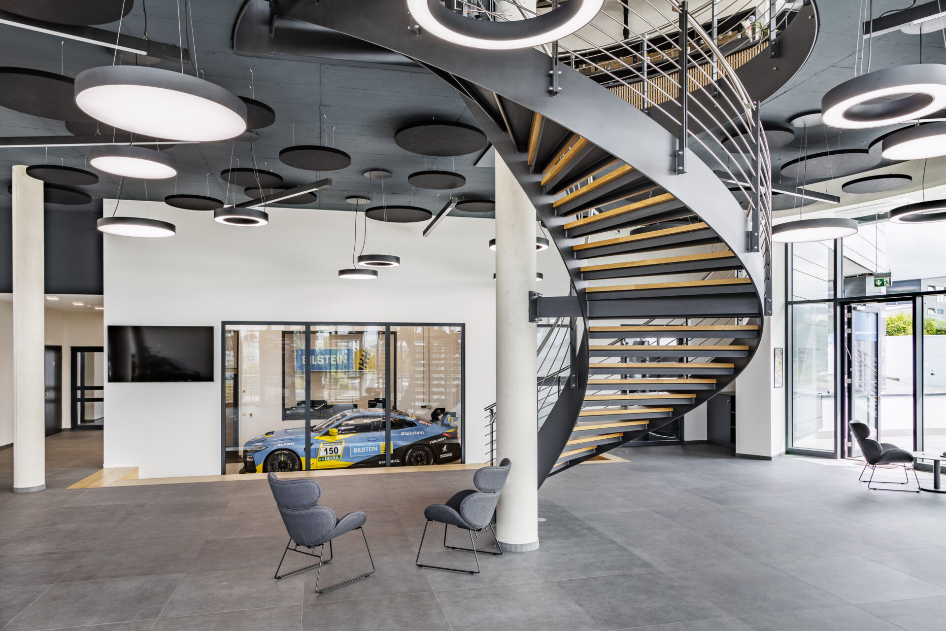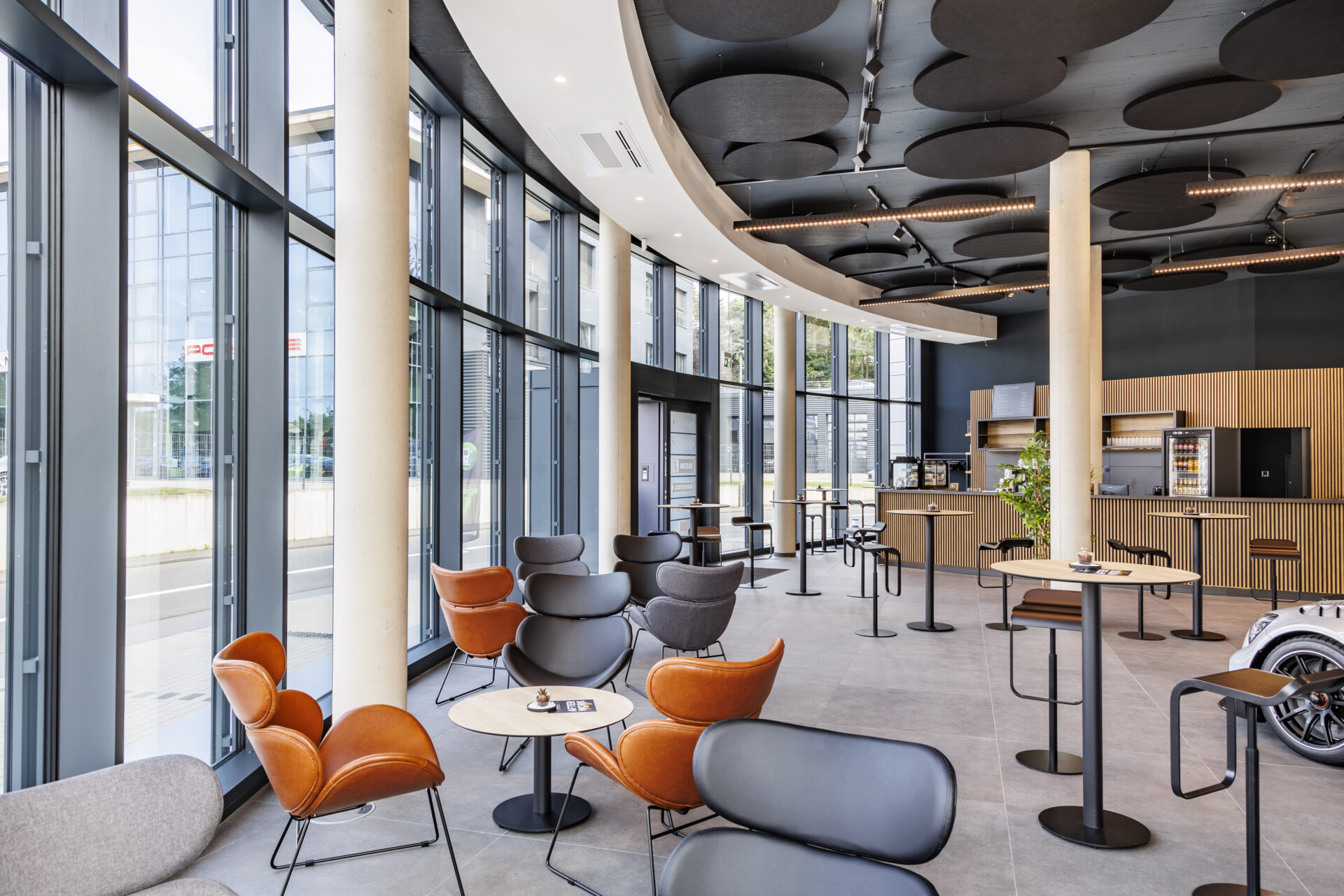 Für Black Falcon fotografierte ich Meetingräume, Aufenthaltsbereiche und die Räumlichkeiten am Nürburgring mit Blick auf die Rennbahn. Die Serie verbindet Interieurfotografie mit der Darstellung von Raumwirkung, Nutzung und Umfeld.
